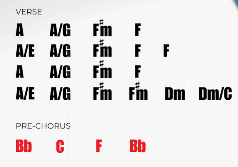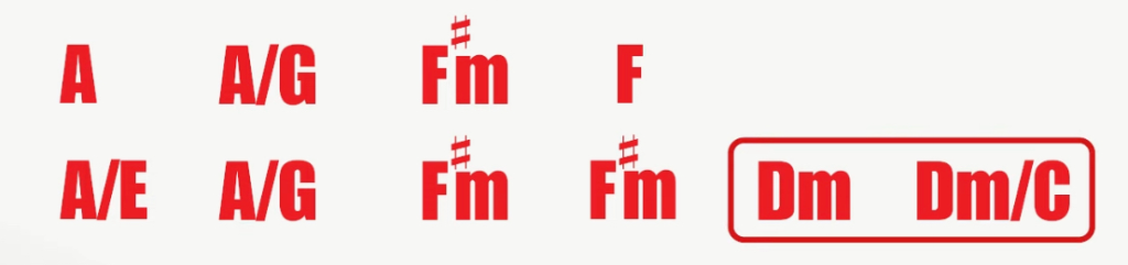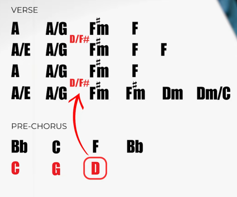 The second half of the verse is almost exactly the same as the first half, except with the addition of Dm and Dm/C at the end. The Dm has the same borrowed chord sound as the F chord. But one important difference here is how there’s a new descending bass line which goes from D to C, and leads us towards the first chord of the pre-chorus, which is Bb.