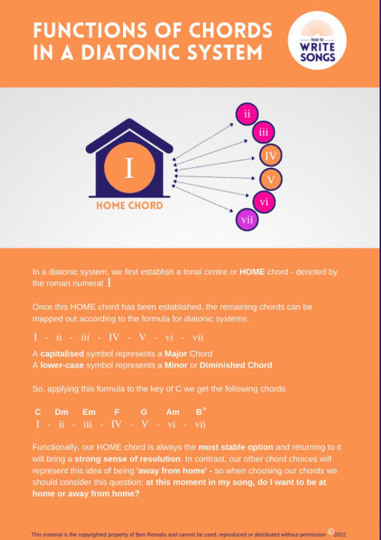 If you need to brush up on what chords are diatonic to a key, then download this free PDF of the “Functions of Chords in a Diatonic System”: