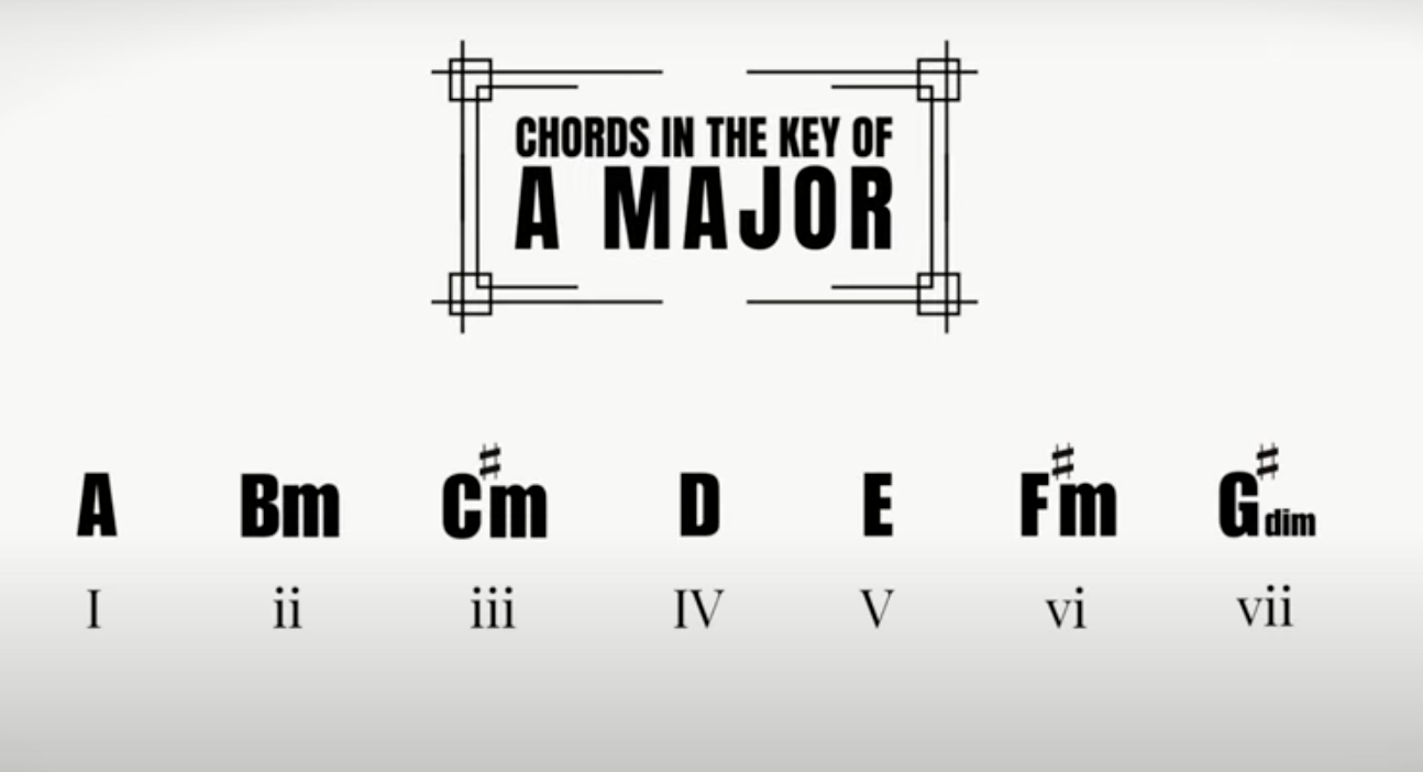 Before we begin to discuss how The Beatles borrowed chords from outside the key, we must first understand the chords that the key contains. The following are the chords in the key of A Major, which is the key of the song: