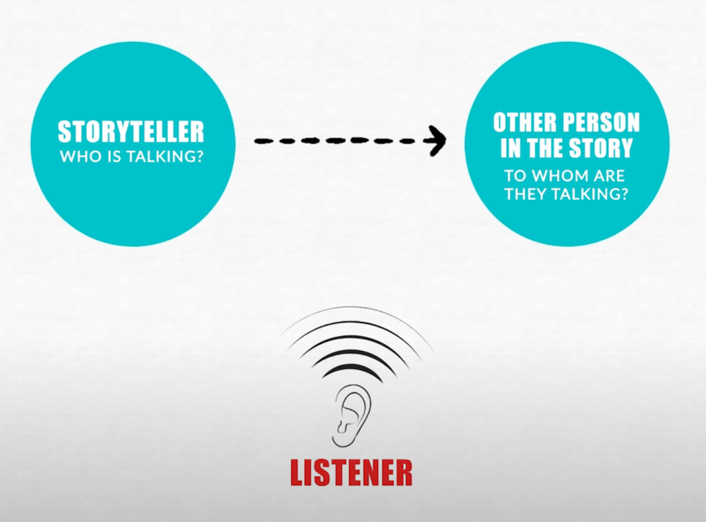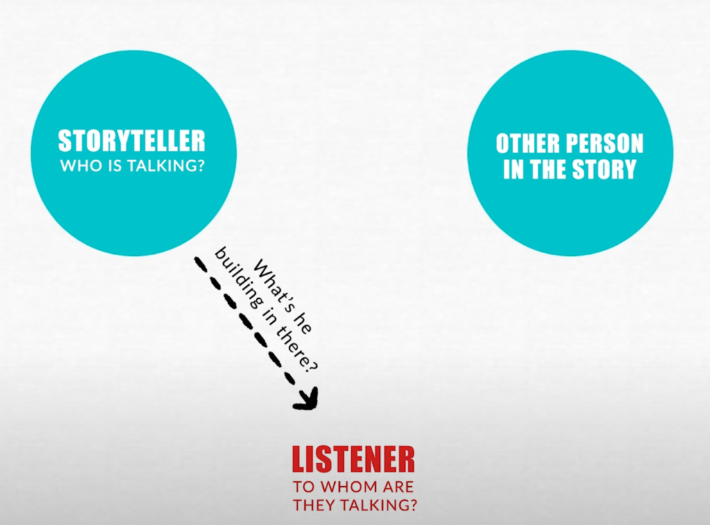 This time, the storyteller is clearly talking about someone else. What’s interesting is that the lyrics have been written in such a way that the listener is included in the storyteller’s conversation. In fact, the storyteller is talking about someone else out loud, with the listener witnessing this monologue. The result is that the listener feels as if the storyteller is gossiping about someone else with them. You can see this illustrated in the graphic below: