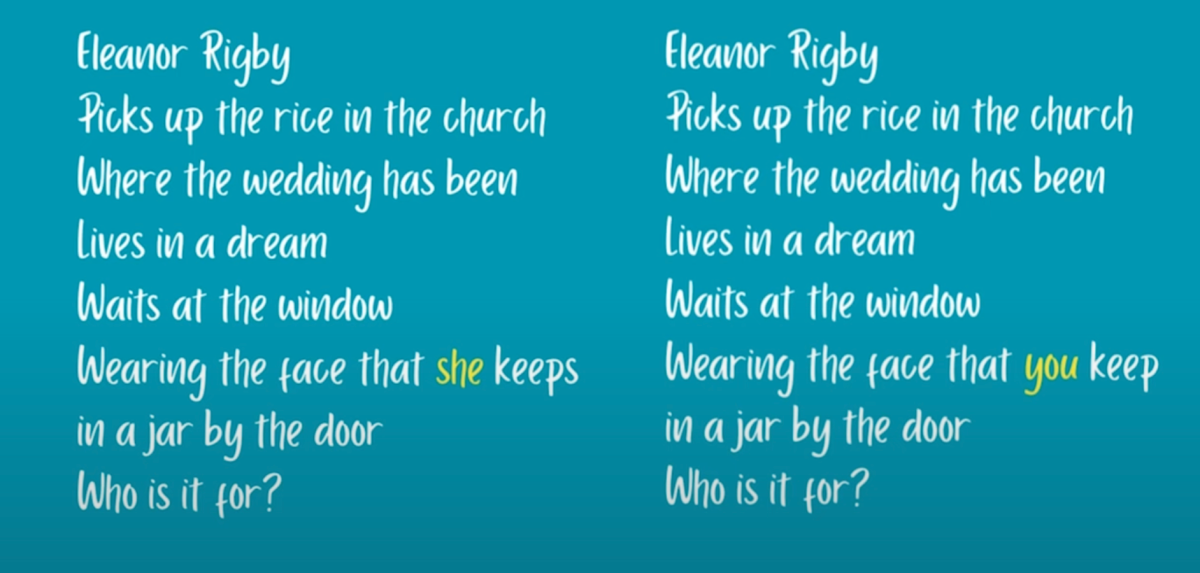The version on the left is of the original song, whilst the version on the right has the same thing but with a changed pronoun. By changing pronouns to “You” after talking about Eleanor Rigby in third person, the listener becomes confused. As a result, they’ll become disorientated, and feel a sense of disconnect with the song’s narrative.