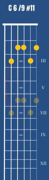 The great thing about this shape is that it’s movable. For example, you could move the C 6/9 shown earlier up two frets to create a D 6/9 instead. If you wanted to get even more complex, you could lift your little finger to the #4 or #11 note. Observe in the image below a C 6/9#11: