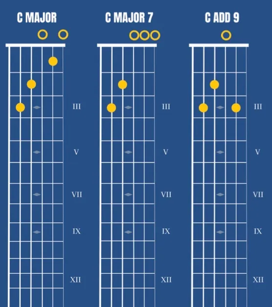 For example, by moving your first finger off, you introduce the major 7 note, which turns it into a Cmaj7. Furthermore, dropping your little finger allows you to add the nine note which turns it into a Cadd9. Observe the images below, where from left to right, we have C Maj, C Maj7 and C Add9: