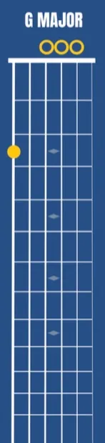 G Major is another common open chord that beginners learn. It sounds great because it relies largely on open strings to create it’s sound. You can enhance that openness by removing all of your fingers and focusing only on the root note, like so: