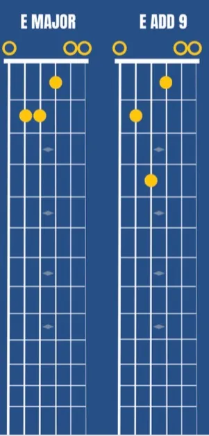 The E Major chord on guitar in it’s original form uses all 6 strings, particularly the lowest one. We can augment this shape to create an E add9 instead, which has a really beautiful, and warm effect – especially if you use a backwards rake to help those open strings shine. Below, you can see E Major on the left and E add9 on the right: