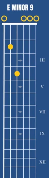 And can even further augment this by adding a 9th note to create an E Min9, which sounds really beautiful, dark and mysterious. Here’s what that chord shape would look like: