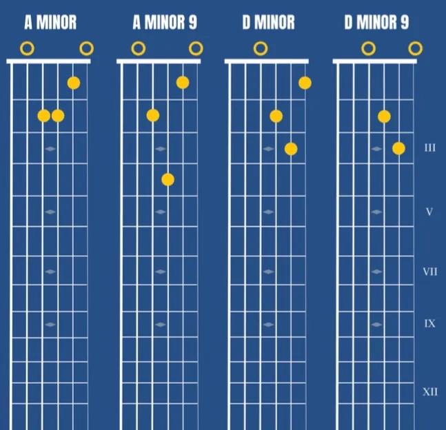 You can also add a 9th to A Minor and D Minor to create A Min9 and D Min9 respectively. Have a look at the image below: