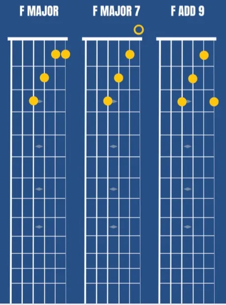 Instead of playing F Major in it’s standard form with a mini barre across two strings, you can leave the last string open to form F Maj7. Doing this also frees up your little finger to potentially add a 9th to form F add9. Below you can see F Maj, F Maj7 and F add9:
