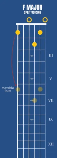 F Major can also be played in a split voicing form where you take your first finger and come across to the sixth string, then put your third finger on the third note to create a sort of tenth voicing, like so: