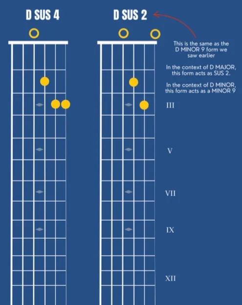 Let’s use D Major as an example. You could take a finger off to create a D Sus2 or add a finger to create a D Sus4.