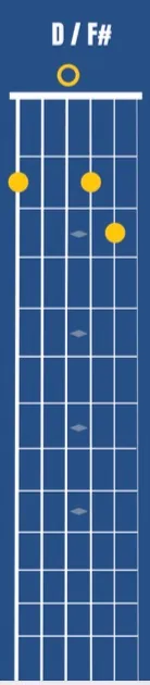 The above two forms of D Major sound great but what we’re going to do now is instead put a F# on the top instead of a D, to create a D/ F#. This is a really rich sounding chord and the chord shape would look like this:
