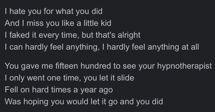Phoebe Bridgers does this well in her song “Motion Sickness”. Below are the lyrics to the first verse: