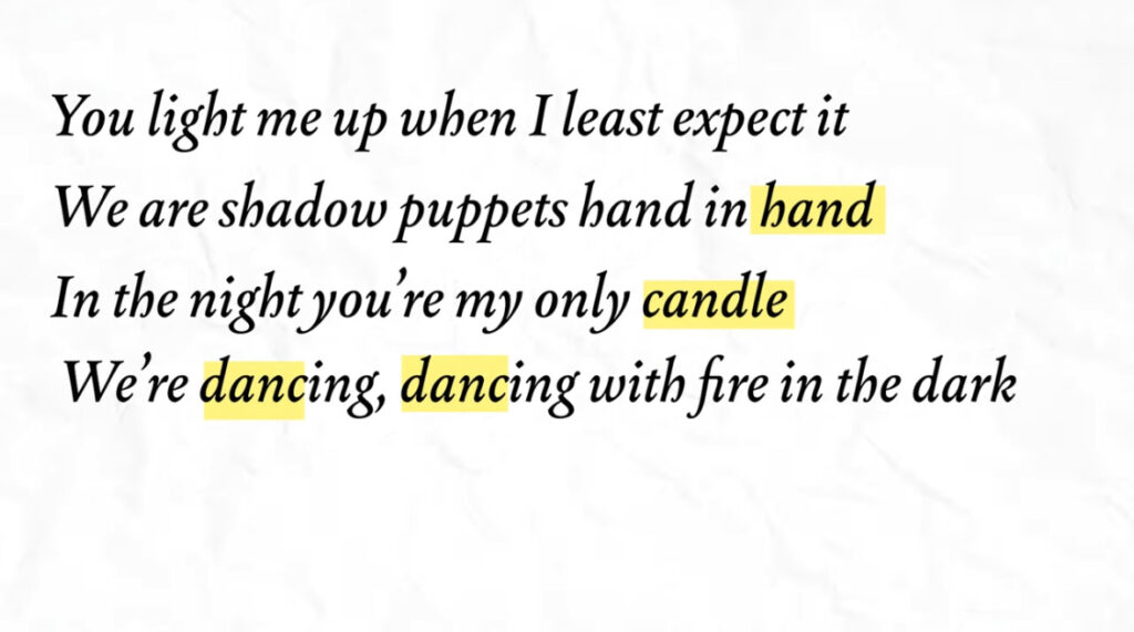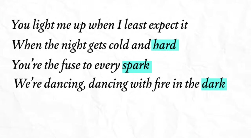 By default, we usually choose the last word of a line to rhyme with. For example, in the line “Dancing with fire in the dark”, we would choose the word “dark” to rhyme with. Below is what that would look like: