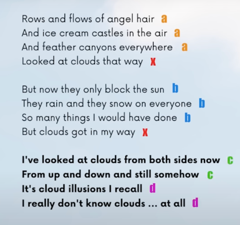Below is an analysis of the rhyme scheme used throughout the verse and chorus of “Both Sides Now”: