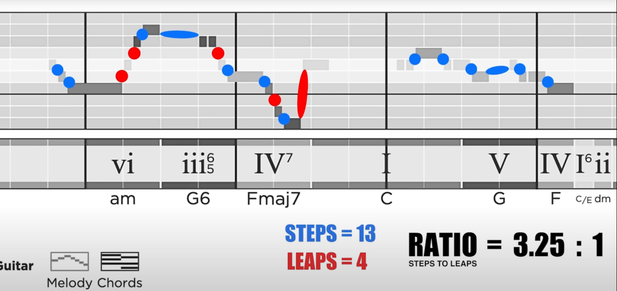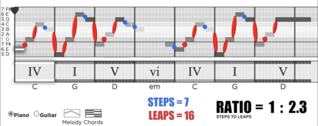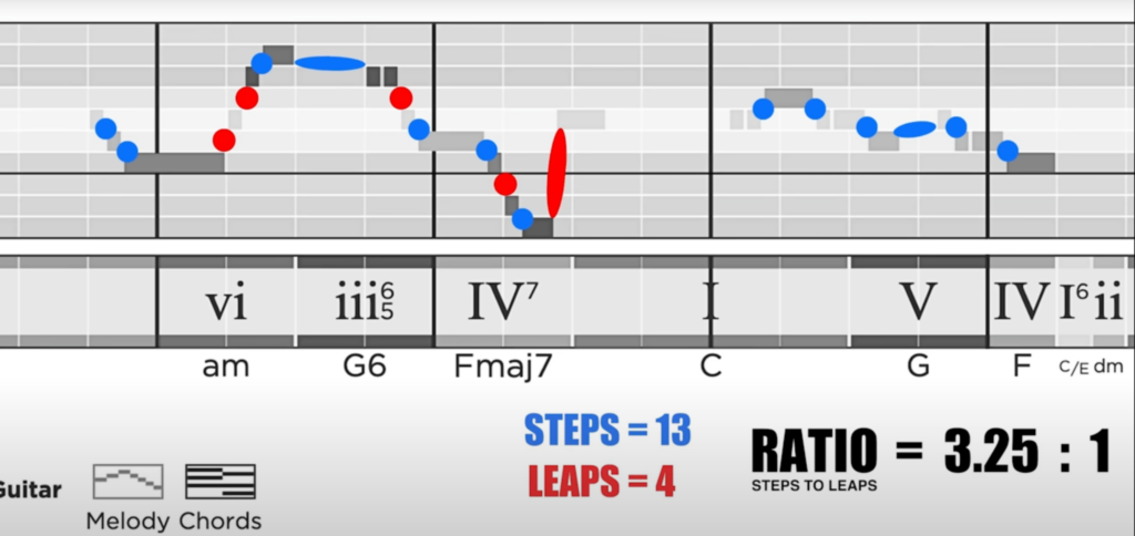 If you analyse other songs, you’ll find that most of them adhere to a ratio of steps to leaps which is somewhere between 3:1 to 4:1, which means there are more steps than leaps. This is because the steps are meant to function as a sort of “glue” holding the leaps together. Meanwhile, the leaps are the moments which really pop out at a listener. You will rarely find a song in which there’s a ratio of 1:1 ie. there are as many steps as there are leaps.