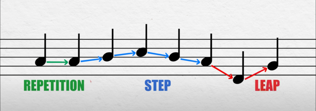 Before we can discuss what makes the melody of “Golden” so memorable, we have to understand the different kinds of movements which a melody can make. The main 3 kinds of movements which make up all melodies are as follows: