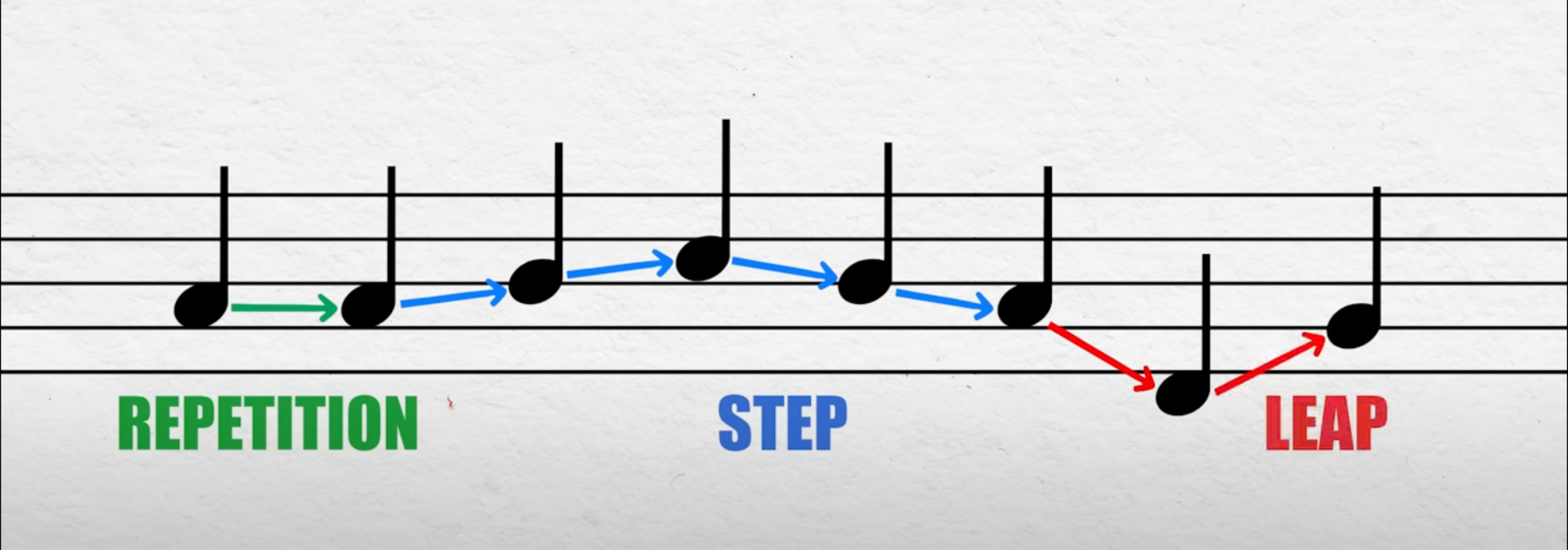 - Leaps – This is when a note jumps over at least one note in the scale, either in an upwards or downwards pattern.